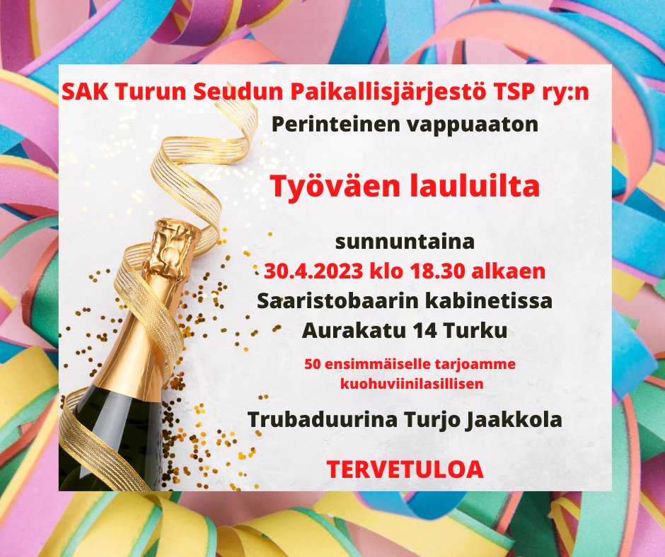SAK Turun Seudun Paikallisjärjestö järjestää työväenlauluillan Saaristobaarissa klo: 18.30 alkaen.
